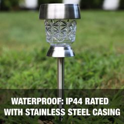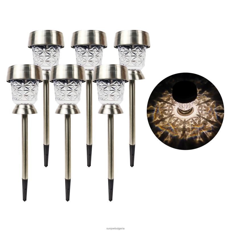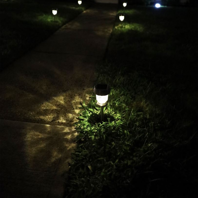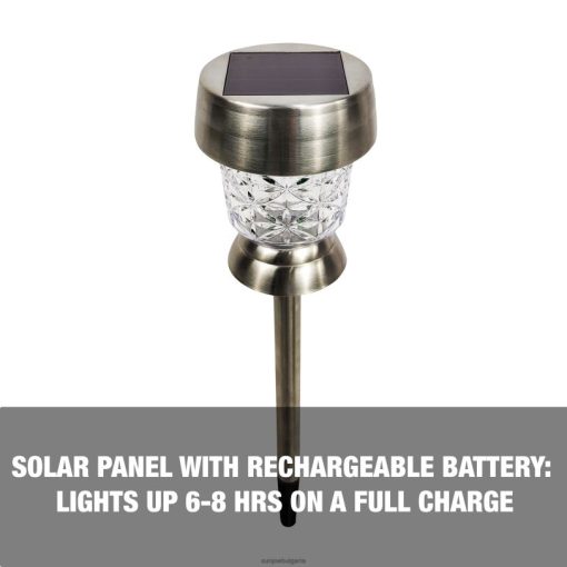 с блаженството на открито Комплект от 6 светодиодни светлини за пътеки можете да впрегнете слънчевата енергия през деня и да осветявате вашата градина, пътека или алея през нощта! те също така добавят красив светещ дизайн, който се отлива върху повърхности, докато са осветени, добавяйки топлина и приятен акцент към всяка неосветена зона. направени с корпус от неръждаема стомана, тези светодиодни светлини са издръжливи и IP44 устойчиви на атмосферни влияния, за да предотвратят навлизането на вода, заедно с устойчивост на ръжда в продължение на години. включва сензор за здрач до зори с аморфен слънчев панел, който се зарежда през деня и се включва автоматично през нощта. всяка лампа съдържа акумулаторна 300 mah ni-mh батерия и с пълно зареждане може да работи до 6-8 часа непрекъснато. той е идеален за облицоване на пътеки, пътеки, вътрешен двор, палуба и други! не се изисква инсталиране или сглобяване, така че се настройва за минути. предлага се с 1 година гаранция… намерете своето блаженство !