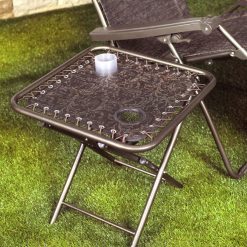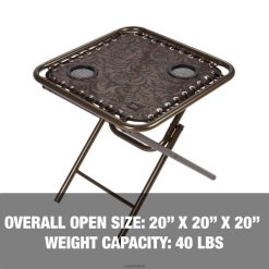 сгъваемата външна странична масичка bliss hammocks съвпада перфектно с нашата серия шезлонги и люлеещи се столове без гравитация. има две вградени поставки за чаши (всяка с диаметър 3 инча) и много допълнително пространство за съхранение на храна или списания. няма необходимост от сглобяване – просто разгънете и използвайте. плотът на масата е изработен от материал за прашка със здраво опънати бънджи въжета около стоманена рамка, за да осигури здрава, издръжлива повърхност за вашите неща. само с 6,6 lbs., той може бързо да се мести из двора с лекота. за лесно съхранение, тази маса за прашка се сгъва обратно до 26″ x 20″ x 3″. общ отворен размер на продукта: 20″ x 20″ x 20″. капацитет на тегло: 40 lbs.