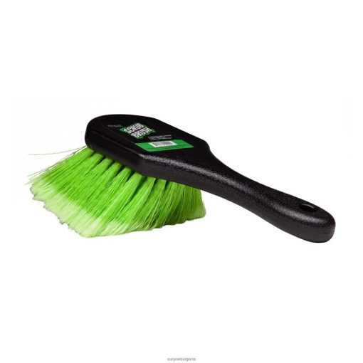 Slick products Scrub Brush е издръжлива, пластмасова четка с къса дръжка и меки синтетични косми, предназначена за маневриране в труднодостъпни места. бързо и лесно почиства мръсотия, масло и мръсотия, когато се използва с гладки почистващи продукти.