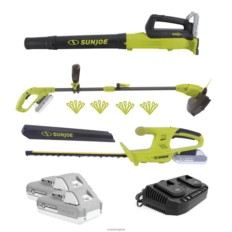 с ексклузивната литиево-йонна батерия ionmax на sun joe за продължителна, акумулаторна работа, тези 24-волтови* инструменти са точно за подрязване на жив плет, кантиране на пътека из градината и метене на отломки!