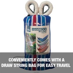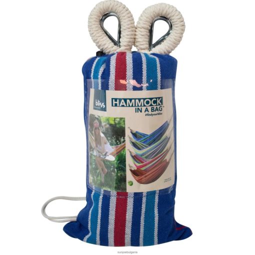 хамакът в чанта е универсален хамак в пълен размер в бразилски стил. изработена от тъкана смес от дишащ полиестер и екологично чисти рециклирани памучни тъкани. това е най-удобният хамак със събран край, направен да осигури повече комфорт в често натоварени зони като главата, коленете и глезените. краищата на примките са подсилени със стомана и могат да се използват както на закрито, така и на открито с голяма издръжливост. целият хардуер за окачване е включен: (2) винтове за очи и (2) куки, които улесняват окачването между дърветата или от вътрешен таван и могат да бъдат окачени като легло или стол за хамак. общото тегло на този хамак е 220 фунта. и се предлага с едногодишна гаранция…намерете своето блаженство