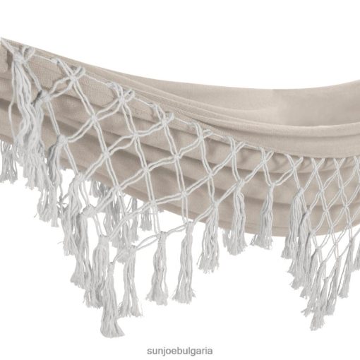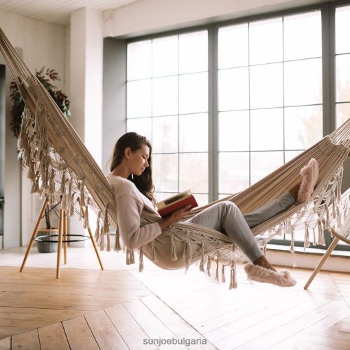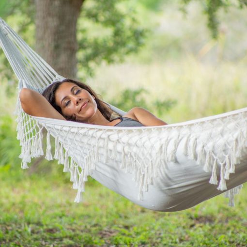 хамакът с ресни в чанта е универсален хамак в пълен размер в бразилски стил. Изработен от тъкана смес от дишащ полиестер и екологично чисти рециклирани памучни тъкани, той е най-удобният хамак със събран край, направен да осигури повече комфорт в често натоварени зони като главата, коленете и глезените. неутрална бежова палитра и плетен дизайн на ресни придава на този хамак традиционен, но модерен бохемски вид; идеален за модерен стилен декор. краищата на примките са подсилени със стомана за допълнителна издръжливост. включен е целият хардуер за окачване, което го прави лесен за окачване между дървета или от вътрешен таван и може да бъде окачен като легло или стол за хамак. всички въжета за хамаци bliss са направени от здрави екологични рециклирани материали и се предлагат с една година гаранция…намерете своите блаженства