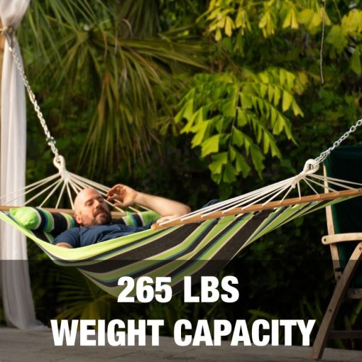 представете си себе си в тропически рай, докато релаксирате цял ден! тази серия от блажени хамаци разполага с лостове от твърда дървесина, забавни цветове на ивици, здрава конструкция и подходяща възглавница. най-добрата част от този хамак са решетките от твърда дървесина, които държат хамака опънат широко отворен, така че винаги да се чувствате така, сякаш си почивате на легло с пълен размер. този извънгабаритен хамак има размер на леглото 48″ ш x 78″ д с обща дължина 9,5′. Екологична, устойчива на цветове смес от полиестер/памук материя осигурява дълготрайни живи цветове и прави този хамак перфектен за дълги дрямки и пълна релаксация. предлага се в голямо разнообразие от живи цветове. всички въжета за хамаци bliss са направени от здрав, екологично чист рециклиран памук със стоманени подсилени бримки, които предлагат издръжливост. идва с хардуер за окачване, включително набор от вериги и куки, които са покрити, за да устоят на атмосферни влияния. има 265 паунда. капацитет на тегло и се предлага с една година гаранция…намерете своето блаженство