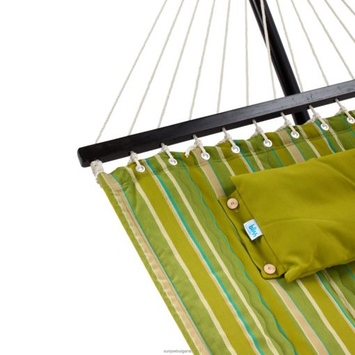 отпуснете деня си с блажените хамаци Двуместен двуместен ватиран хамак с олефин и възглавница с копчета. лесната за почистване, водоотблъскваща, UV-защитена, устойчива на цвят олефинова тъкан е обратима: плътна от едната страна и на райета от другата. капитонираното легло за хамак има уникален двоен s-шев, който помага на хамака да се приспособи към тялото ви за допълнителен комфорт, като същевременно запазва пълнежа на място. неразлагащите се щанги от твърда дървесина са лакирани в цвят тъмен махагон за елегантен допир, а издръжливото 6 мм полиестерно въже се простира от решетките до краищата и издържа на сурово време. включва също подходяща възглавница с копчета, която може да се прикрепи към двата края на хамака и 1 година гаранция…намерете своето блаженство