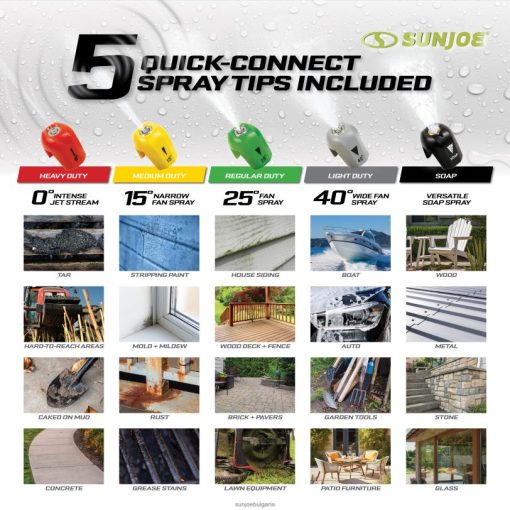 - 5 дюзи за бързо свързване (0o, 15o, 25o, 40o и сапун) за справяне с различни проекти за почистване