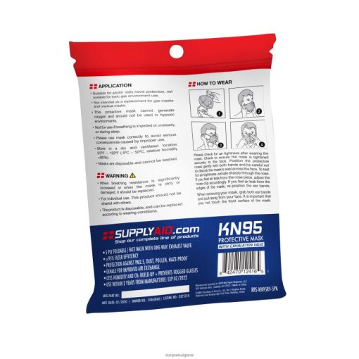 supplyaid kn95 5-слойна сгъваема маска с вентил за издишване е подходяща за ежедневна защита на възрастни при пътуване. маската kn95 не трябва да се използва като заместител на противогази или като медицинска маска. маската не може да генерира кислород и не трябва да се използва в хипоксична среда. когато се използва правилно, маската осигурява приблизително 95% ефективност на филтъра и ефективно защитава здравето на дихателните пътища. еднопосочната клапа за издишване блокира частиците при вдишване и изпуска въздух при издишване. използвайте маската kn95, за да се предпазите от pm2.5, прах, полени, микроорганизми и замърсяване на въздуха. използвайте маската в рамките на 3 години от производството и трябва да се съхранява на сухо и проветриво място 23° – 122° (-5° – 50°, относителна влажност