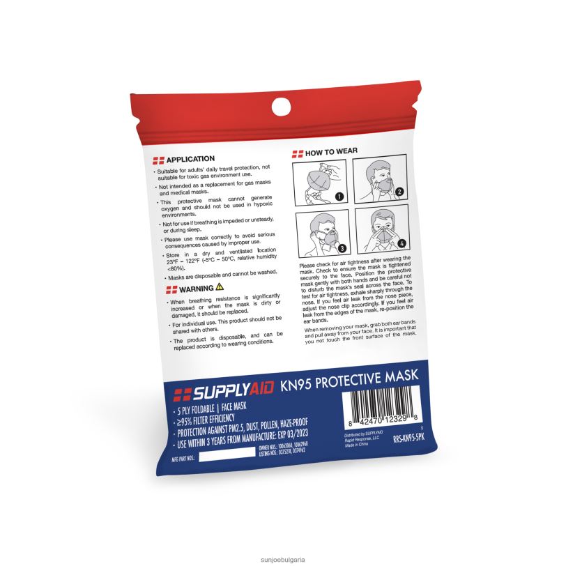 5-слойната сгъваема маска kn95 на supplyaid е подходяща за ежедневна защита на възрастни при пътуване. маската kn95 не трябва да се използва като заместител на противогази или като медицинска маска. маската не може да генерира кислород и не трябва да се използва в хипоксична среда. когато се използва правилно, маската осигурява приблизително 95% ефективност на филтъра и ефективно защитава здравето на дихателните пътища. използвайте маската kn95, за да се предпазите от pm2.5, прах, полени, микроорганизми и замърсяване на въздуха. използвайте маската в рамките на 3 години от производството и трябва да се съхранява на сухо и проветриво място 23° – 122° (-5° – 50°, относителна влажност